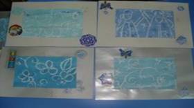 - на столі: кисті з середнім ворсом, розведені синя і біла гуаш, маленька палітра, половину альбомного листа з вже нанесеним свічкою невидимим малюнком, блиск - олівці, стаканчики з водою на кожну дитину;