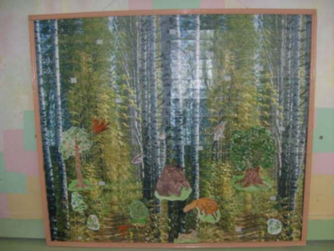 Принциповою відмінністю "панно" від фланелеграфа є те, що в якості основи я використала не однотонну тканину, а великі календарі із зображенням березового лісу. Розмір "панно" - 1,2 м?1 м. (Замість календарів можна взяти фотошпалери з видами природи.)