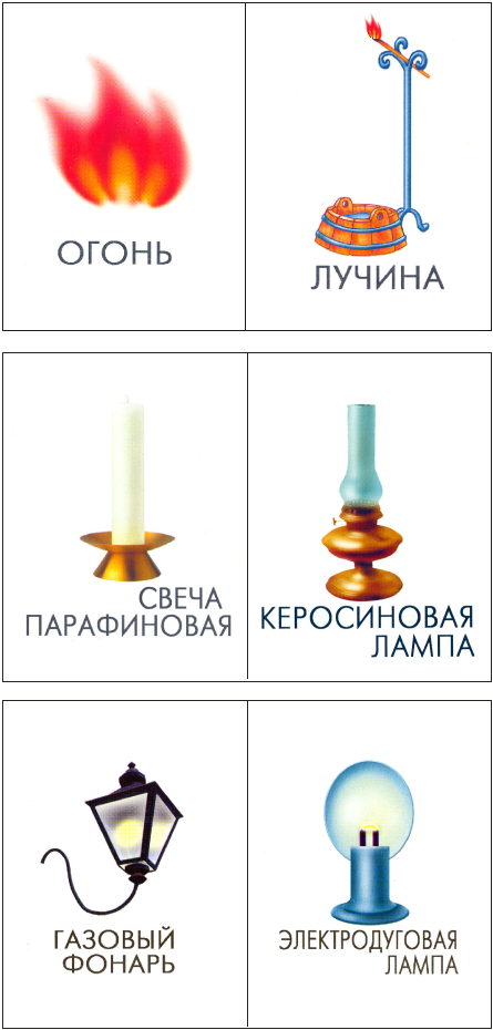 Зміст: 1. Дати дітям уявлення про технічний прогрес на прикладі знайомства з історією розвитку освітлювальних приладів - електричної лампочки. 2. Розвивати вміння складати ланцюжок розвитку від багаття до сучасних освітлювальних приладів. 3. Формувати інтерес до історії. Обладнання: Ілюстрації життя стародавніх людей, печі і скіпи в будинках, маяків, старовинної вулиці і ліхтарів, гасової лампи, довга тонка суха тріска, свічка, сірники, блюдце. Література: