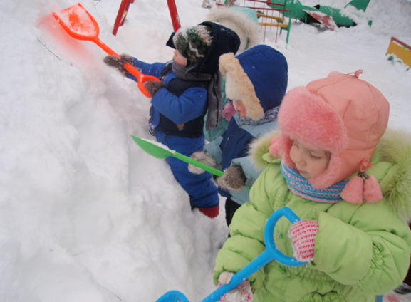 - Хлопці, ви вже помітили, що багато снігу намело. Я вам пропоную всім разом дружно прибрати ділянку від снігу. Сніг на лопаточку беремо, в купку загальну несемо. Ділянка очищаємо, корисну роботу виконуємо. Очистили, молодці! Ось зараз і позайматися можна.