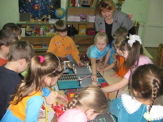 Вихователь підводить дітей до макету охороняється залізничного переїзду. Розподіляє ролі і пропонує дітям пограти.