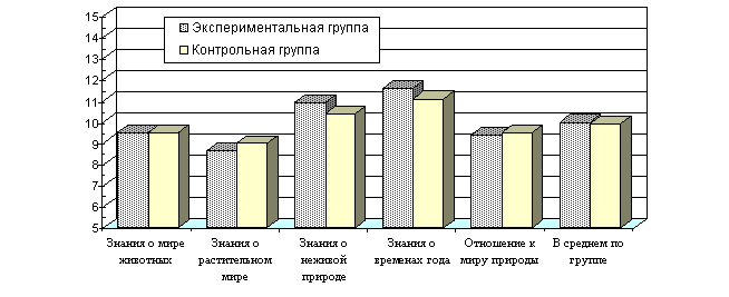 Порівнюючи результати діагностики експериментальної і контрольної груп (табл. 1-2, рис.1), констатуємо: 1. Дошкільнята експериментальної і контрольної груп у цілому показали середній рівень сформованості екологічних знань та екологічно правильного ставлення до світу природи - відповідно 10,0 і 9,9 балів. 2. Рівень знання дошкільників експериментальної та контрольної груп про світ тварин однаковий - 9,5 бала. 3. Рівень знання про рослинний світ та рівень екологічно правильного ставлення до світу природи у дошкільнят експериментальної групи нижче, ніж у дошкільнят контрольної групи відповідно на 0,4 і 0,1 бала. 4. Рівень знань про неживу природу та пори року у дошкільнят експериментальної групи вище, ніж у дошкільнят контрольної групи на 0,5 бала. Крім того, порівнюючи розподіл оцінок результатів діяльності дошкільнят у відсотковому співвідношенні (табл. 3), приходимо до висновку, що в цілому показники дошкільнят з експериментальної групи більш "розкидані", у них більше, ніж у дошкільнят контрольної групи як високих, так і низьких оцінок, що ускладнює роботу з групою.