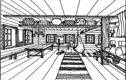 Підлога в кімнаті дерев'яні. Стоїть стіл теж з дерева. На підлозі лежать доріжки. Нагорі перебувають дерев'яні полиці, на яких стоять глиняні глечики, коробки з різними припасами. А в кутку кімнати знаходиться піч, про яку ми з вами раніше говорили.