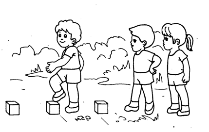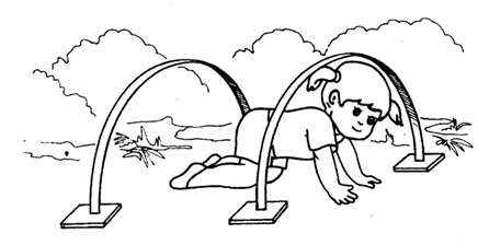 - Діти по колу йдуть по містку, стрибають по м'яких модулів (купинах), подлезают під дуги, намагаючись не зачепити їх, стрибають з просуванням вперед у плоскі обручі, йдуть по лавці переступаючи кубики, тримаючи спину прямо, зістрибують, підтягування лежачи на лавці.