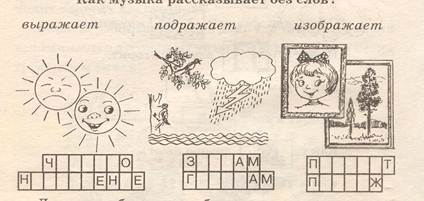 Завдання: Запропонувати дітям по картинках розповісти про музику: що виражає, чому наслідує, що зображує?