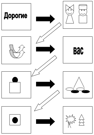 4. Потім метафоричні фрази вставляють в смисловий контекст картини (Літньою порою сніжинки лісу радували око дітей і дорослих.) 7. Гра «Циферблат пропозицій». Мета: Вправляти дітей у складанні поширених пропозицій про події, що відбуваються з даним об'єктом картини, що складаються з 8-10 слів - моделей. Перед початком роботи кожна дитина отримує «циферблат годинника», на якому послідовність і кількість слів у реченні показано стрілками і набір з моделями-картинками, що зображують той чи інший предмет (об'єкт) або привід; порожні фішки, для того, щоб дошкільнята могли вставити в речення слова, не позначені картинкою. Вибраний об'єкт, його дії та ознаки дітям необхідно схематизировать (позначити моделлю) самостійно. Потім діти складають послідовні, поширені речення і «зачитують» їх одноліткам. 8. Підсумок (пригадування ігор та їх цілей; заохочення дітей). |