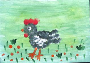 Мета: Закріпити з дітьми спосіб малювання - отпечатывание пальцями. Вчити малювати добре знайомий об'єкт, дотримуватися пропорції, прикрашати свій малюнок додатковими деталями. Виховувати уяву. Матеріали: половина тонованого альбомного аркуша з силуетом курки, акварель, вологі серветки, вода, кисть для змочування фарби і промальовування деталей. Попередня робота: розглядання ілюстрацій із зображенням курки, читання потішок, віршів. Хід роботи: - Жили - були Дід і Баба. Була у них курочка Ряба. Хлопці, ви всі добре знаєте цю казку. А я хочу вам розповісти її продовження. - Одного разу курочка Ряба поїхала в гості до свого дядька в сусідню Півнику село. Дід з Бабою дуже нудьгували за своєю улюбленицею. І, хоча вона часто дзвонила їм по телефону, вони сідали на лавочці біля будинку і зітхали. У них не було навіть її фотографії. Хлопці, давайте допоможемо Дідові з Бабою. Намалюємо для них портрет їх улюблениці - курочки Ряби. Сьогодні головним інструментом для малювання у нас будуть наші пальчики. Ми з вами вже багато разів малювали пальчиками і знаємо, що спочатку треба змочити фарби. Після того, як ми приготували свої фарби до роботи, давайте згадаємо, яким кольором була курочка. У казці говориться, що вона Ряба, значить, її оперення складається з декількох кольорів (чорного, білого, коричневого). Спочатку ви повинні пальчиками обвести контур курки (голова, тулуб), потім заповнюємо контур відбитками пальців, домальовували хвостик (маленький), червоний гребінець, маленьку борідку, промальовуємо крильце. Коли фарба підсохне, домальовували очей (спочатку білої фарбою, потім зіниця - чорної). Малюємо лапки, дзьоб, квіти, травичку. Ось і готовий портрет курочки Ряби для Діда і Баби. Розміщую всі малюнки на стенді. Вибираємо саму веселу і саму сумну курочку; саму ошатну і т. д. Дякую дітей за роботу.Заняття закінчено.