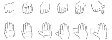 Верхній ряд малюнків показує ускладнення і удосконалення рухів пальців: спочатку діє вся долоня та пальці, поступово виокремлюються руху окремих пальців. Нижній ряд показує, як змінюється положення захоплюваного об'єкта з розвитком рухів пальців: спочатку він лежить на долоні, а пізніше - тільки в кінчиках пальців.