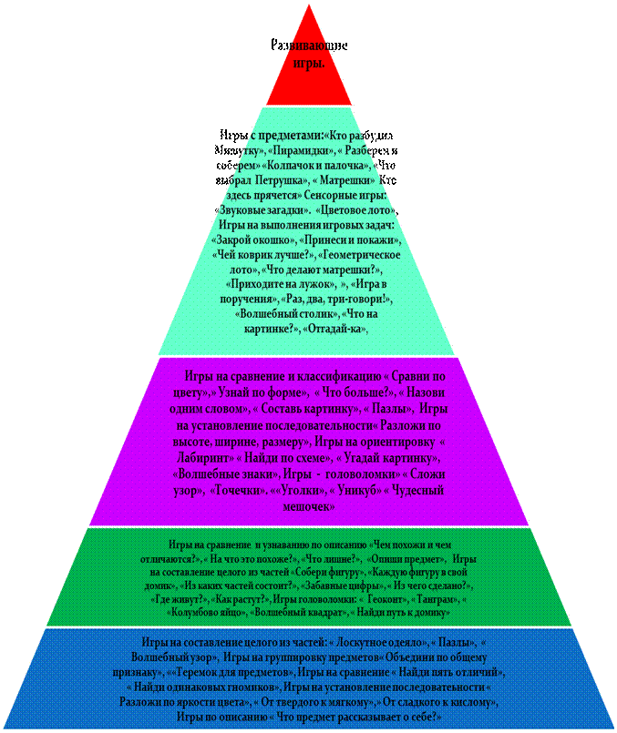 Проблему, збагачення сенсорного досвіду, вгадування предметів за описом, групування об'єктів на основі істотних ознак, виділення частини з цілого, порівняння і впізнавання за описом, встановлення послідовності, допомагають вирішити розвиваючі ігри. Розвитку просторових уявлень у дітей сприяють ігри, пов'язані з орієнтуванням за схемою, моделі, плану, умовним знакам. Інтелектуально - пізнавальні здібності дошкільнят розвивають ігри - головоломки