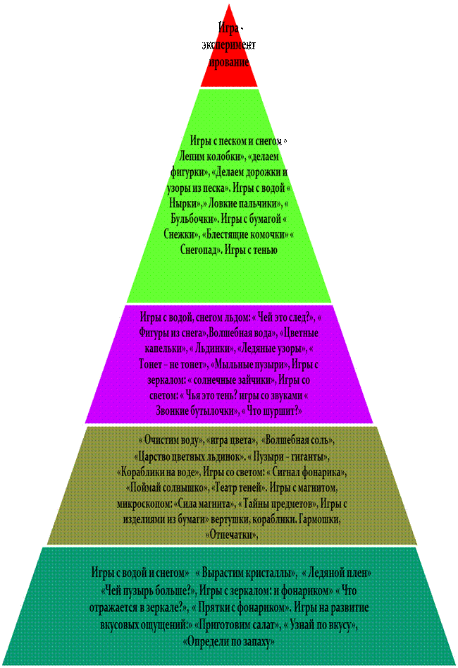 Розвитку пізнавального інтересу, залучення до дослідницької діяльності сприяють ігри - експерименти з різними предметами і матеріалами: ігри з водою, снігом, льодом; ігри з дзеркалом, ігри зі світлом, ігри зі склом, ігри зі звуками, ігри з природним матеріалом, ігри з піском, глиною, землею. Вони ставлять перед дитиною проблемно - пошукову ситуацію і створюють умови самостійного пошуку