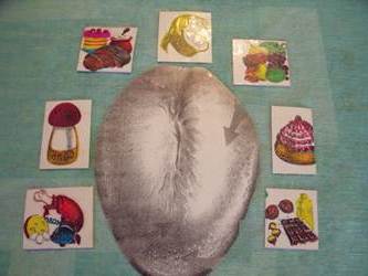 Матеріал: чорна коробка з двома отворами; предмети: дерев'яний грибок, матрьошка, пластмасовий кубик, маленький гумовий кульку, скляна пляшечка, шматочок хутра (або іграшка).