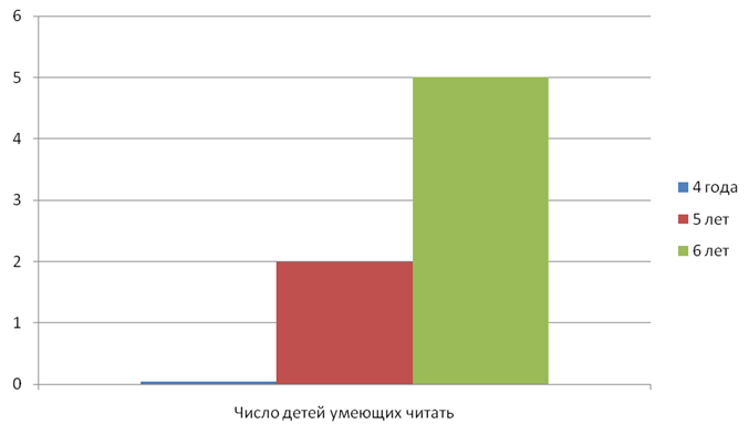 На діаграмі чітко видно, що діти 4-х річного віку ще не вміють читати. Не всі діти і 5-ти років опанували читання. А ось шестирічні діти все вміють, або хоча б намагаються читати. Якщо зіставити дану діаграму з попередніми, то простежується очевидна взаємозв'язок. Як вже було зазначено вище, у дітей 4-х років лише зачатки оперативної пам'яті. Це прямо пропорційно до того, що вони взагалі не вміють читати. Діти 5-ти років показують проміжні (між 4-х і 6-ти літніми дітьми) дані у розвитку оперативної пам'яті, і як наслідок займають проміжне місце за вмінням читати. Читає тільки частина дітей 5-ти років. Більш високого розвитку (за показниками першої діаграми) досягає оперативна пам'ять до 6-7 років. Всі продиагностированные діти даного віку вміють читати. Цей вік є найбільш сприятливим для надходження дитини в школу.