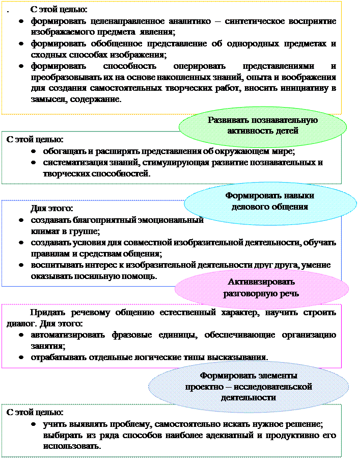Всі цикли занять вибудовані в певній системі. Перші заняття кожного циклу є навчальними. Через пряме навчання дітей знайомлять з предметами і явищами, які їм належить зображати, і навчають способам зображення. На наступних заняттях вміння і навички формують і закріплюють. Від заняття до заняття зростає самостійність дітей.