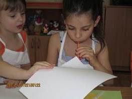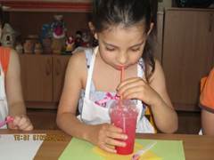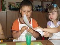 Щоб у всіх дітей залишилися листочки з портретами Мильних Бульбашок різних кольорів, педагог змінює стаканчики по черзі по квітам спектра. Діти починають малювати мильними бульбашками по парам, допомагаючи один одному.