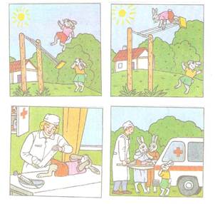 Середина казки: Діти описують, що бачать на картинках. Висувають припущення, чому зайченя розкачувався так сильно (влаштували змагання, хто вище розгойдається). Вигадують, хто викликав «Швидку допомогу». (Цікаві пропозиції записуються на магнітофон)