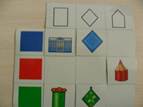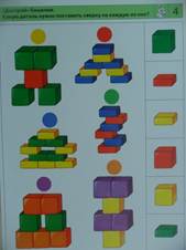 Квадрат-будівельник просить нас допомогти йому добудувати башточки. За допомогою планшета «Логіко-малюк» ви поставите відсутню деталь зверху на кожну з башточок. Але зробити це необхідно, використовуючи тільки деталі і кольори самій вежі. Перевірте один в одного правильність виконаного завдання. Поясніть вибір.