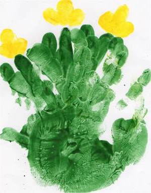 А далі ми опускаємо долоньку у фарбу і прикладаємо до стеблинки наші долоньки, виходять зелені листочки.