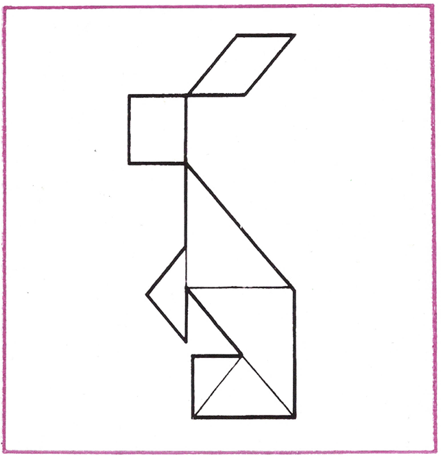 (Голова зайця складається з квадрата, вухо з чотирикутника, тулуб - двох великих трикутників, а лапи теж з трикутників - середнього і маленького).